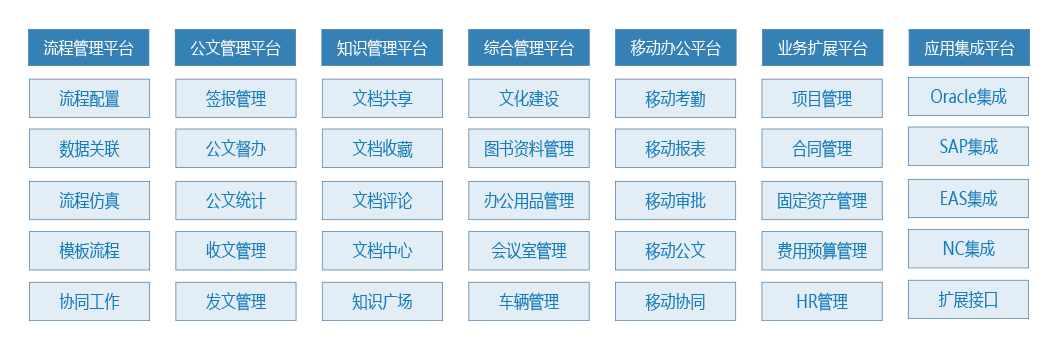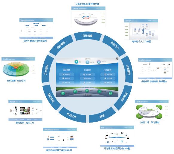 目标管理、会议管理、文化建设、移动办公,并能够与其他异构系统整合,打破信息孤岛,建立完整的有效的企业工作平台