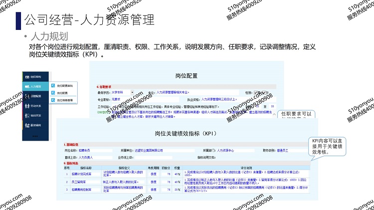 对各个岗位进行规划配置,厘清职责、权限、工作关系,说明发展方向、任职要求,记录调整情况,定义岗位关键绩效指标(KPI)。