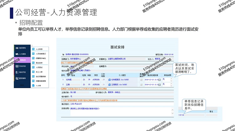 单位内员工可以举荐人才,举荐信息记录到招聘信息。人力部门根据举荐或收集的应聘者简历进行面试安排