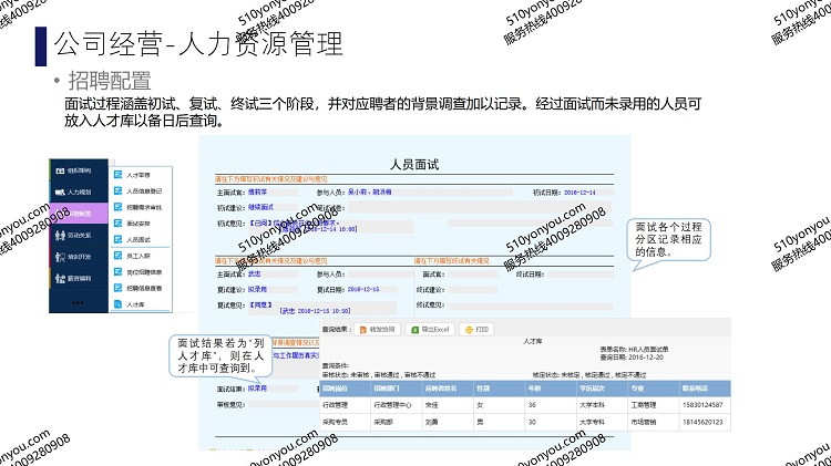 面试过程涵盖初试、复试、终试三个阶段,并对应聘者的背景调查加以记录。经过面试而未录用的人员可放入人才库以备日后查询。