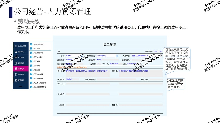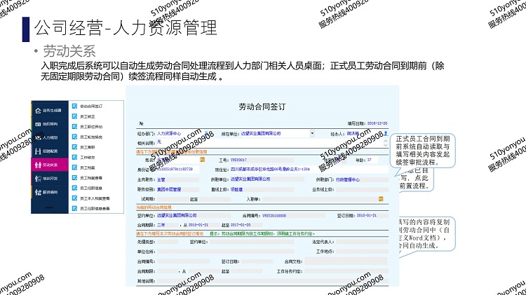 入职完成后系统可以自动生成劳动合同处理流程到人力部门相关人员桌面;正式员工劳动合同到期前(除无固定期限劳动合同)续签流程同样自动生成 。