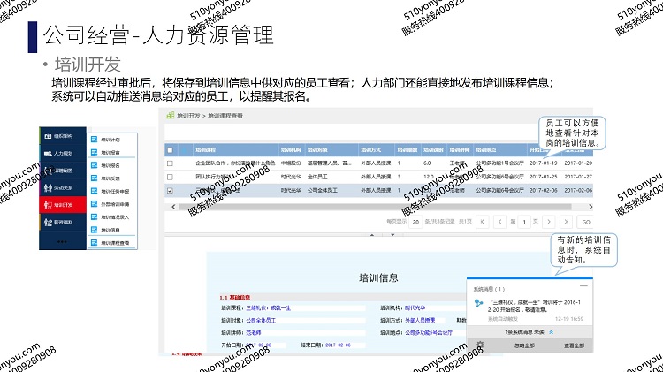 培训课程经过审批后,将保存到培训信息中供对应的员工查看;人力部门还能直接地发布培训课程信息;系统可以自动推送消息给对应的员工,以提醒其报名。