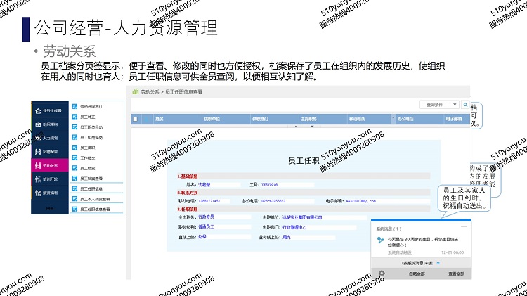 员工档案分页签显示,便于查看、修改的同时也方便授权,档案保存了员工在组织内的发展历史,使组织在用人的同时也育人;员工任职信息可供全员查阅,以便相互认知了解。