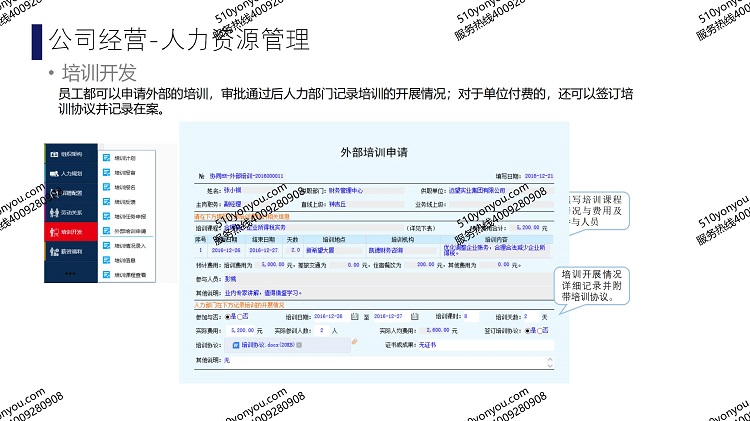 员工都可以申请外部的培训,审批通过后人力部门记录培训的开展情况;对于单位付费的,还可以签订培训协议并记录在案。
